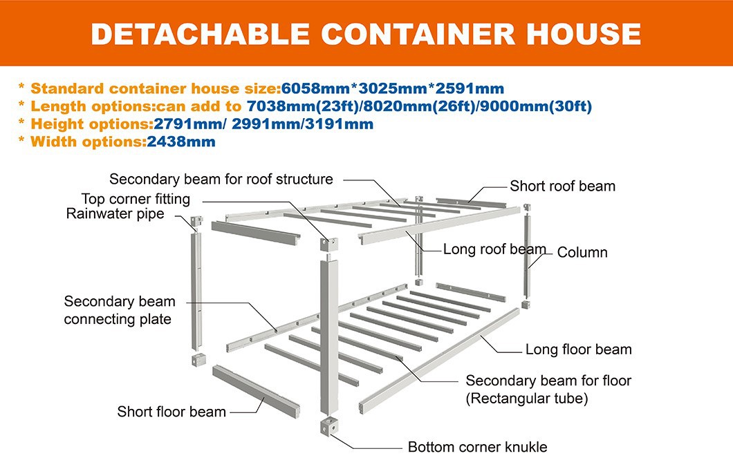 Our detachable container house can save prefabrication cost, bulk packing also can save freight. Detachable can also achieve more flexible space design: we can make the detachable in 3m width and in 9~12m length.